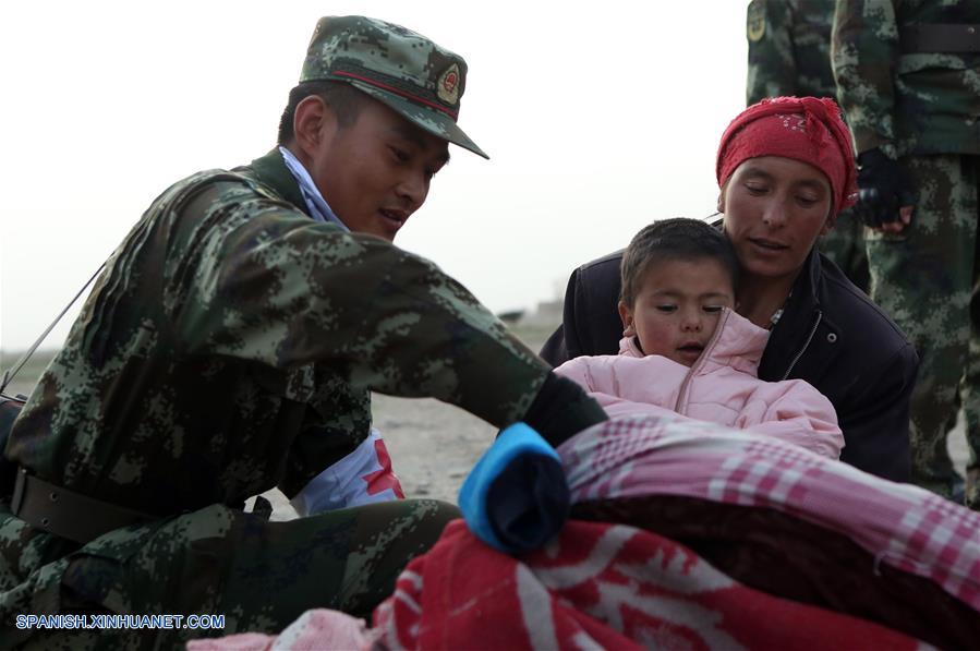 TAXKORGAN, mayo 11, 2017 (Xinhua) -- Un soldado realiza una revisión médica a ni?os en el establecimiento temporal de la aldea Kuzigun en el condado de Taxkorgan, en la Región Autónoma Uygur de Xinjiang, en el noroeste de China, el 11 de mayo de 2017. Ocho personas murieron y 23 más resultaron heridas a causa de un terremoto de magnitud 5.5 que sacudió el jueves a las 5:58 (hora de Beijing) el distrito de Taxkorgan de la Región Autónoma Uygur de Xinjiang, en el noroeste de China, informaron fuentes locales. (Xinhua/Li Jing)