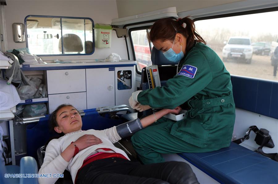 TAXKORGAN, mayo 11, 2017 (Xinhua) -- Un residente recibe una revisión médica en la aldea Kuzigun en el condado de Taxkorgan, en la Región Autónoma Uygur de Xinjiang, en el noroeste de China, el 11 de mayo de 2017. Ocho personas murieron y 23 más resultaron heridas a causa de un terremoto de magnitud 5.5 que sacudió el jueves a las 5:58 (hora de Beijing) el distrito de Taxkorgan de la Región Autónoma Uygur de Xinjiang, en el noroeste de China, informaron fuentes locales. (Xinhua/Li Jing)
