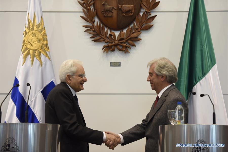 MONTEVIDEO, mayo 11, 2017 (Xinhua) -- El presidente uruguayo, Tabaré Vázquez (d), estrecha la mano de su homólogo de Italia, Sergio Mattarella (i), durante una conferencia de prensa conjunta en la Torre Ejecutiva, en Montevideo, capital de Uruguay, el 11 de mayo de 2017. Los presidentes de Uruguay e Italia, Tabaré Vázquez y Sergio Mattarella, respectivamente, expresaron el jueves su optimismo de que el Mercado Común del Sur (Mercosur) y la Unión Europea (UE) aprobarán este a?o un acuerdo de libre comercio. (Xinhua/Nicolás Celaya)