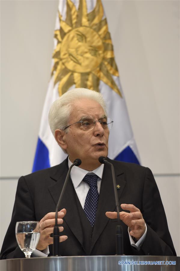 MONTEVIDEO, mayo 11, 2017 (Xinhua) -- El presidente de Italia, Sergio Mattarella, participa durante una conferencia de prensa conjunta con su homólogo uruguayo, Tabaré Vázquez, en la Torre Ejecutiva, en Montevideo, capital de Uruguay, el 11 de mayo de 2017. Los presidentes de Uruguay e Italia, Tabaré Vázquez y Sergio Mattarella, respectivamente, expresaron el jueves su optimismo de que el Mercado Común del Sur (Mercosur) y la Unión Europea (UE) aprobarán este a?o un acuerdo de libre comercio. (Xinhua/Nicolás Celaya)
