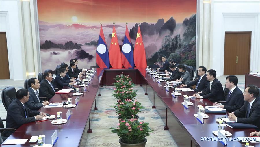 El primer ministro chino Li Keqiang se reúne con el presidente de Laos Bounnhang Vorachit, quien se encuentra en Beijing para asistir al próximo Foro de Cinturones y Caminos para la Cooperación Internacional, en el Gran Salón del Pueblo de Pekín, capital de China, el 13 de mayo de 2017.(Xinhua/Pang Xinglei)