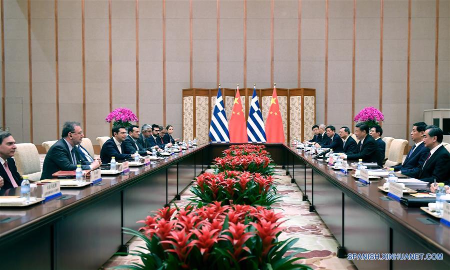 El presidente de China, Xi Jinping, se reúne con el primer ministro griego, Alexis Tsipras, quien está aquí para asistir al Foro de Cinturones y Caminos para la Cooperación Internacional en Pekín, capital de China, el 13 de mayo de 2017.(Xinhua/Zhang Duo)
