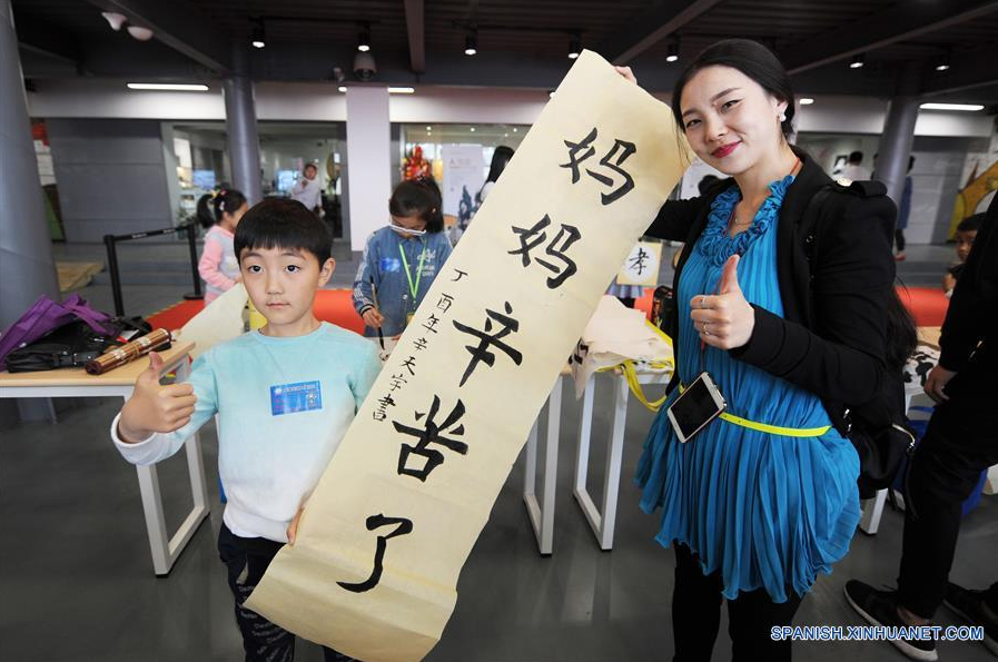 Un ni?o entrega a su madre un trabajo de caligrafía en vísperas de la celebración del Día de las Madres, en Qingdao, provincia de Shandong, en el este de China, el 13 de mayo de 2017. (Xinhua/Wang Haibin)
