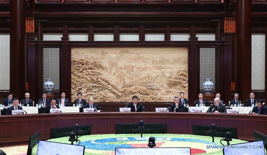 El presidente de China, Xi Jinping (c), preside la Mesa Redonda de Líderes del Foro de la Franja y la Ruta para la Cooperación Internacional en el Centro Internacional de Convenciones del Lago Yanqi en Beijing, capital de China, el 15 de mayo de 2017. (Xinhua/Ju Peng)