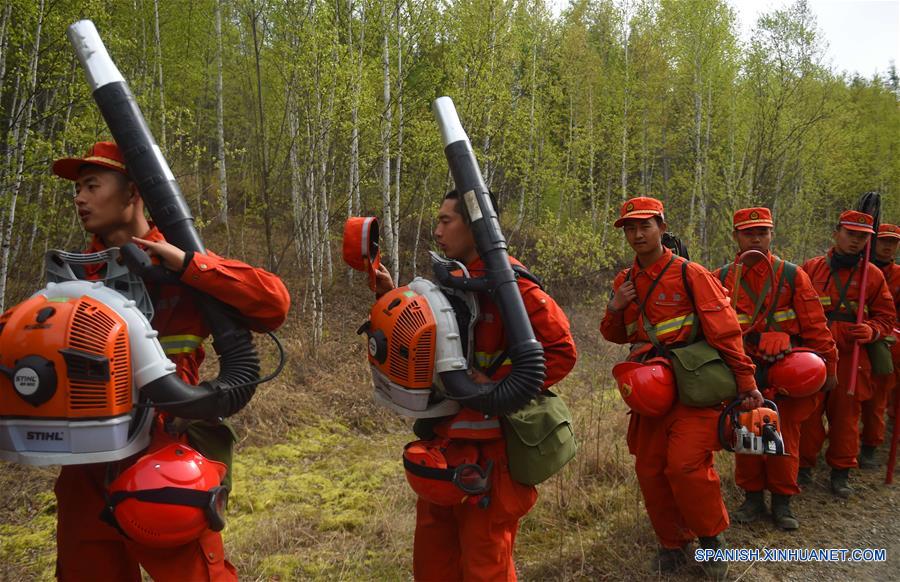 Policías forestales cargan equipo para enfrentar un incendio forestal en la bandera de Chenbaerhu, en la ciudad de Hulunbuir, en la Región Autónoma de Mongolia Interior, en el norte de China, el 20 de mayo de 2017. Un incendio forestal que comenzó el miércoles en la Región Autónoma de Mongolia Interior, en el norte de China, ha sido controlado gracias a un grupo de 8,000 bomberos, informaron el sábado las autoridades locales. (Xinhua/Deng Hua)