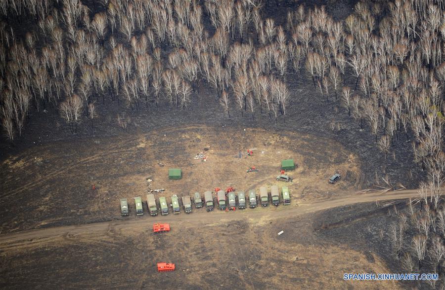 Policías forestales esperan órdenes mientras enfrentan un incendio forestal en la bandera de Chenbaerhu, en la ciudad de Hulunbuir, en la Región Autónoma de Mongolia Interior, en el norte de China, el 20 de mayo de 2017. Un incendio forestal que comenzó el miércoles en la Región Autónoma de Mongolia Interior, en el norte de China, ha sido controlado gracias a un grupo de 8,000 bomberos, informaron el sábado las autoridades locales. (Xinhua/Deng Hua)