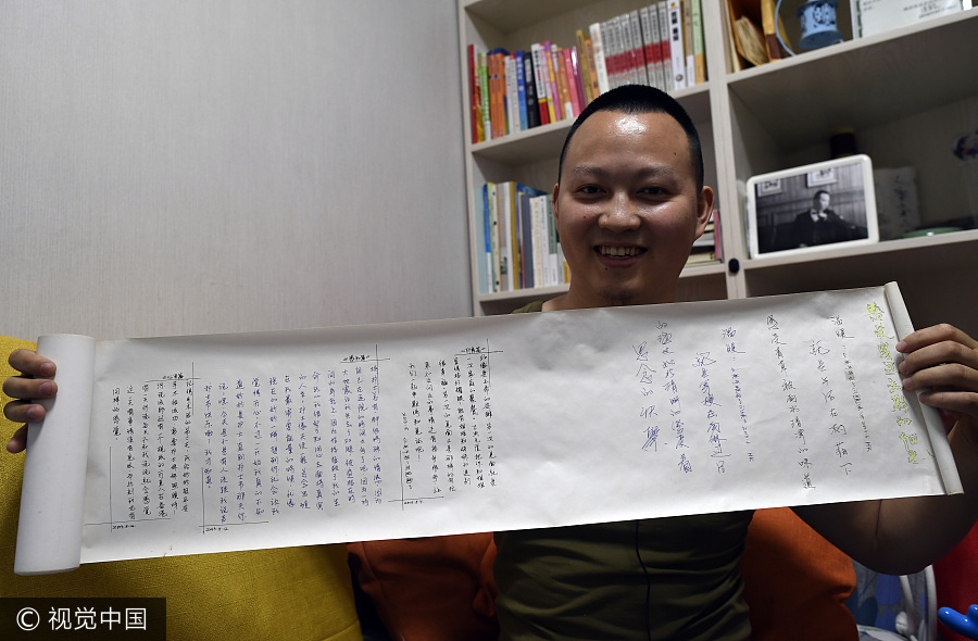Dai Guohua, un hombre que perdió ambas extremidades en un terremoto, muestra un pergamino en el que escribió poemas a su mujer. [Foto / VCG]