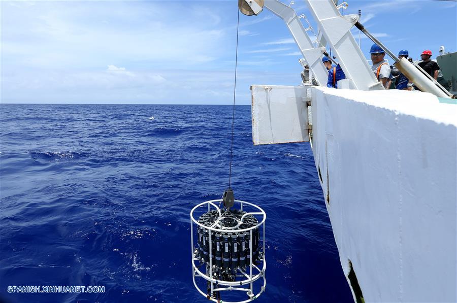 A BORDO DEL XIANGYANGHONG 09, mayo 22, 2017 (Xinhua) -- Científicos prueban la temperatura, salinidad y profundidad del agua mientras se preparan para la inmersión del Jiaolong, el sumergible tripulado chino, a bordo del barco Xiangyanghong 09, el 22 de mayo de 2017. El barco llegó el lunes a la zona de las Marianas y comenzó a probar la temperatura, salinidad y profundidad para la inmersión del martes en el Estrecho de las Marianas, la primera de la tercera fase de la expedición. (Xinhua/Liu Shiping)
