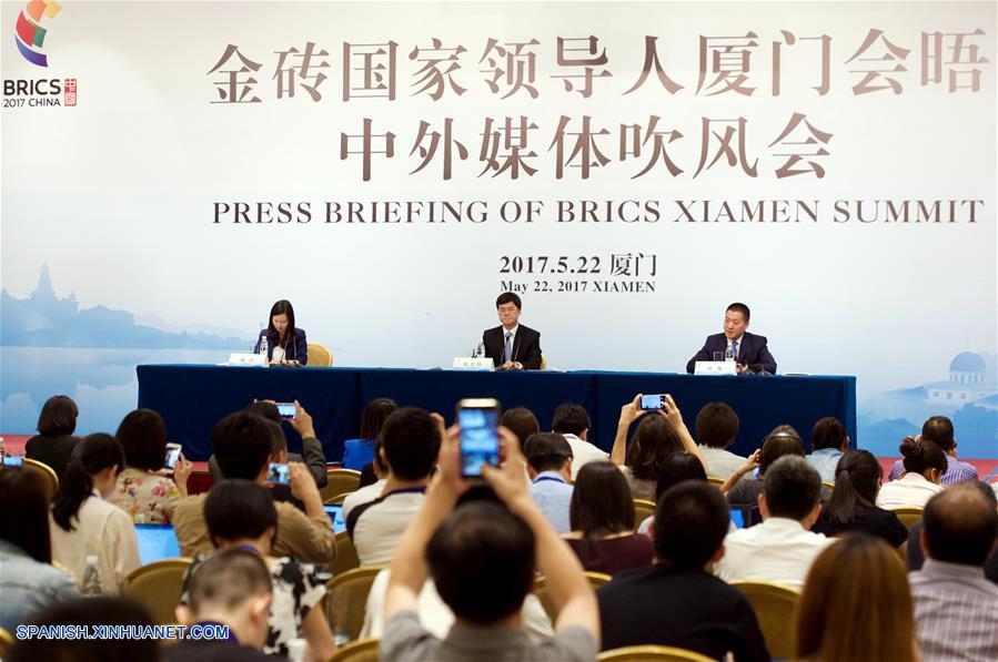 XIAMEN, mayo 22, 2017 (Xinhua) -- Una rueda de prensa de la Cumbre de Xiamen de BRICS (Brasil, Rusia, India, China y Sudáfrica) es llevada a cabo en Xiamen, en la provincia de Fujian, en el sureste de China, el 22 de mayo de 2017. La novena Cumbre de BRICS se llevará a cabo en Xiamen en septiembre. (Xinhua/Jiang Kehong)