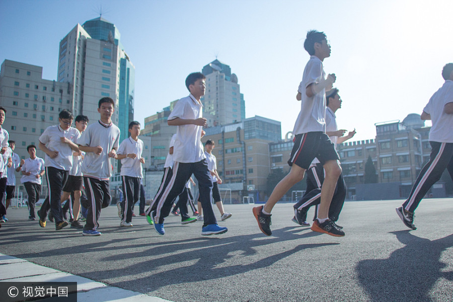 Estudiantes de la Escuela Secundaria Chenjinglun de Beijing ejercitan el cuerpo para mantenerse activo y dar lo mejor de sí. Esta escena forma parte de la dura rutina de repasos previos al examen chino de ingreso a la universidad conocido como gaokao, que comenzará el 7 de junio. [Foto: VCG]