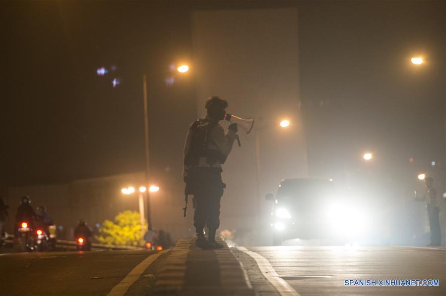 YAKARTA, mayo 24, 2017 (Xinhua) -- Un policía pide a residentes alejarse del sitio de una explosión cerca de una parada de autobús en Kampung Melayu, Yakarta, Indonesia, el 24 de mayo de 2017. Dos personas murieron, incluyendo un policía, en un ataque suicida con bomba ocurrido cerca de una parada de autobús en Yakarta, capital de Indonesia. (Xinhua/Veri Sanovri)