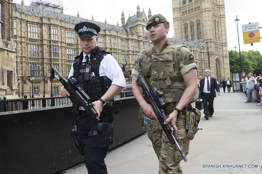 LONDRES, mayo 24, 2017 (Xinhua) -- Un soldado y un policía armados vigilan frente a la sede del Parlamento, en Londres, Reino Unido, el 24 de mayo de 2017. La primera ministra británica Theresa May anunció el martes que el nivel de amenaza terrorista de Reino Unido fue elevado de "severo" a "crítico", el nivel más alto, tras el ataque terrorista suicida ocurrido el lunes por la noche en la Arena Manchester al final de un concierto de música pop, que causó la muerte a por lo menos 22 personas, muchas de las cuales eran menores de edad. (Xinhua/Ray Tang)