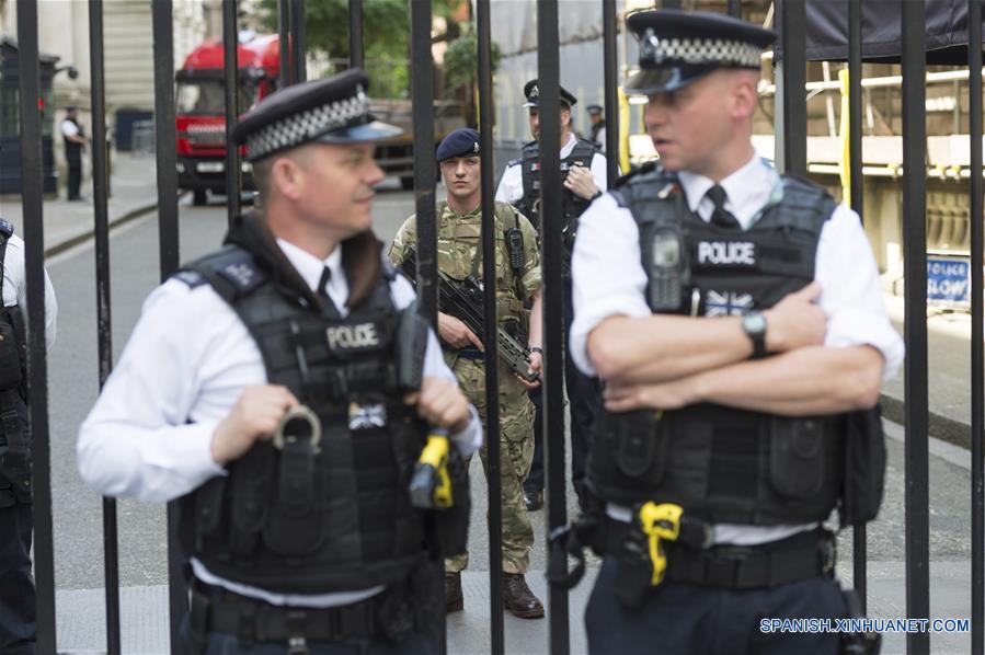 LONDRES, mayo 24, 2017 (Xinhua) -- Elementos de seguridad vigilan frente al número 10 de la calle Downing, en Londres, Reino Unido, el 24 de mayo de 2017. La primera ministra británica Theresa May anunció el martes que el nivel de amenaza terrorista de Reino Unido fue elevado de "severo" a "crítico", el nivel más alto, tras el ataque terrorista suicida ocurrido el lunes por la noche en la Arena Manchester al final de un concierto de música pop, que causó la muerte a por lo menos 22 personas, muchas de las cuales eran menores de edad. (Xinhua/Ray Tang)