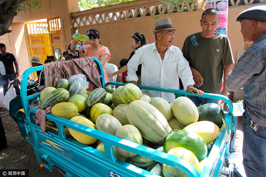 Venta de melones de Hami, región autónoma Xinjiang Uygur. [Foto: VCG]
