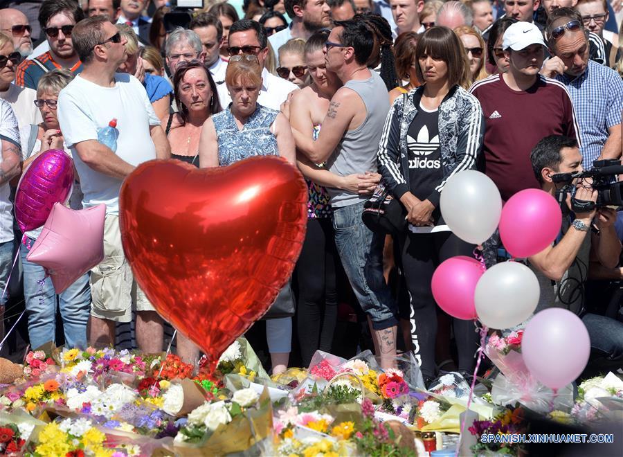 MANCHESTER, mayo 25, 2017 (Xinhua) -- Personas guardan un minuto de silencio en honor a las víctimas del atentado terrorista en la Manchester Arena, en la Plaza de St. Ann en Manchester, Reino Unido, el 25 de mayo de 2017. La policía sigue buscando a posibles terroristas y encontró artículos significativos para la investigación sobre el ataque en Manchester, se informó el jueves. (Xinhua/Andrew Parsons/i-Images/ZUMAPRESS)
