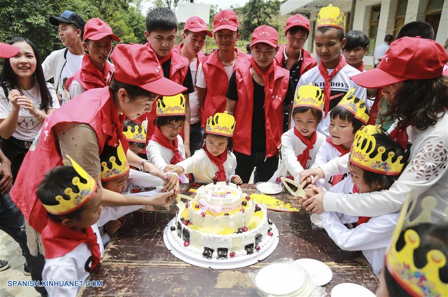 GUIZHOU, mayo 31, 2017 (Xinhua) -- Ni?os y voluntarios celebran el próximo Día Internacional del Ni?o formando una tarta en la Escuela Primaria Baobao, en el condado de Zhenning, provincia de Guizhou, en el suroeste de China, el 31 de mayo de 2017. Los ni?os alrededor del país participaron en actividades para celebrar el próximo Día Internacional del ni?o. (Xinhua/Lu Wei)