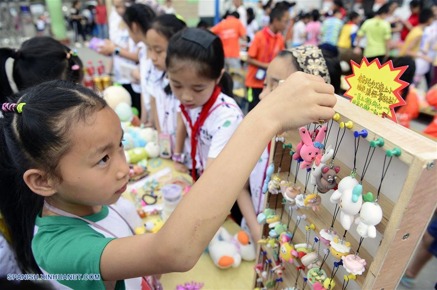 GUANGXI, mayo 31, 2017 (Xinhua) -- Ni?as compran regalos en una feria escolar en la Escuela Primaria Longsheng, en el Condado Autónomo de Varias Nacionalidades de Longsheng, en la Región Autónoma Zhuang de Guangxi, en el sur de China, el 31 de mayo de 2017. Los ni?os alrededor del país participaron en actividades para celebrar el próximo Día Internacional del ni?o. (Xinhua/Wu Shengbin)