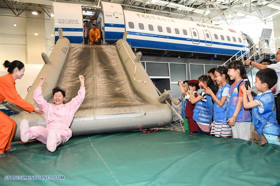 BEIJING, junio 1, 2017 (Xinhua) -- Ni?os observan una demostración de un sistema de escape de emergencia para aeronaves, en la sede de la empresa Air China, en Beijing, capital de China, el 1 de junio de 2017. Un grupo de ni?os de entre 6 y 13 a?os visitó el jueves la sede de la aerolínea en el marco del Día Internacional del Ni?o. (Xinhua/Li He)
