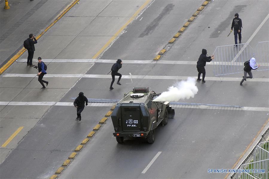 SANTIAGO, junio 1, 2017 (Xinhua) -- Manifestantes participan en un enfrentamiento con elementos de las fuerzas de seguridad durante una marcha convocada por la Confederación de Estudiantes de Chile (CONFECH), la Coordinadora NO+AFP, la Coordinadora de Estudiantes Secundarios (Cones), el Colegio de Profesores, entre otras organizaciones político sociales, en Santiago, capital de Chile, el 1 de junio de 2017. La marcha realizada en paralelo a la última cuenta anual de la presidenta de Chile, Michelle Bachelet, en el Congreso Nacional, tiene como objetivo fundamental, dar un ultimátum para que el Gobierno incorpore la gratuidad universal a la educación, el fin al lucro, el fin de las Administradoras de Fondos de Pensiones (AFP) de Chile, entre otras demandas sociales, de acuerdo con información de la prensa local. (Xinhua/Sebastián Beltrán Gaete/AGENCIAUNO)