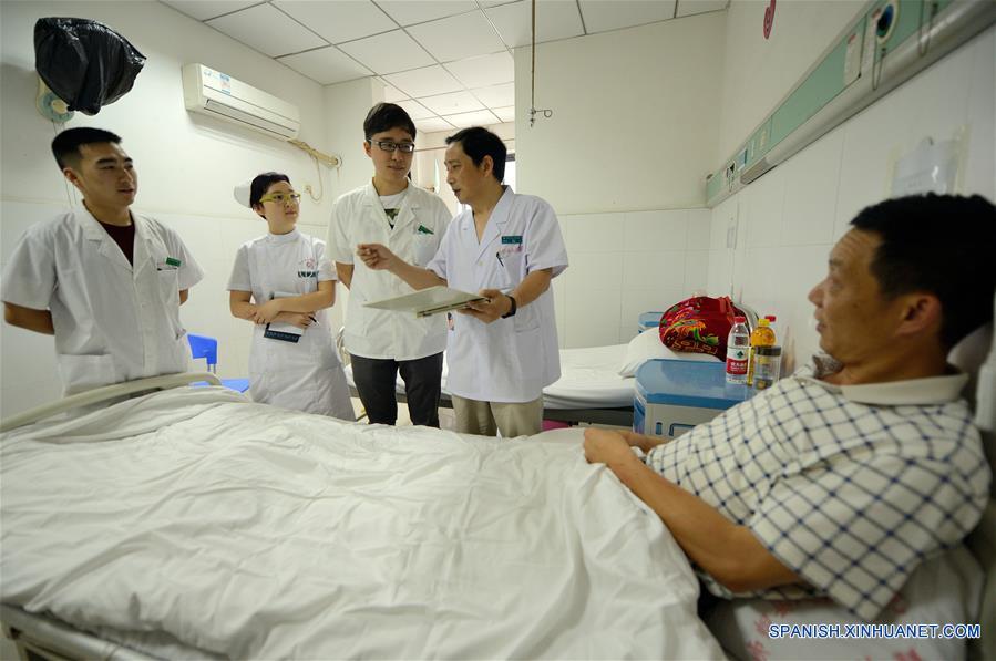 El cirujano Mei Changqing (2-d), ve a un paciente en el Hospital del Pueblo del condado de Zigui, provincia de Hubei, en el centro de China, el 3 de junio de 2017. Mei Changqing es uno de los que se beneficiaron de la reanudación del examen de ingreso a la universidad en 1977. El cirujano, siendo un tipógrafo en 1976 luego de su graduación de la secundaria, cambió su destino realizando el examen de ingreso a la universidad en 1977 y fue matriculado por la Escuela de Medicina de Yichang. Habiendo estado dedicado a la medicina clínica durante 30 a?os, Mei Changqing está orgulloso de su elección. (Xinhua/Lei Yong)