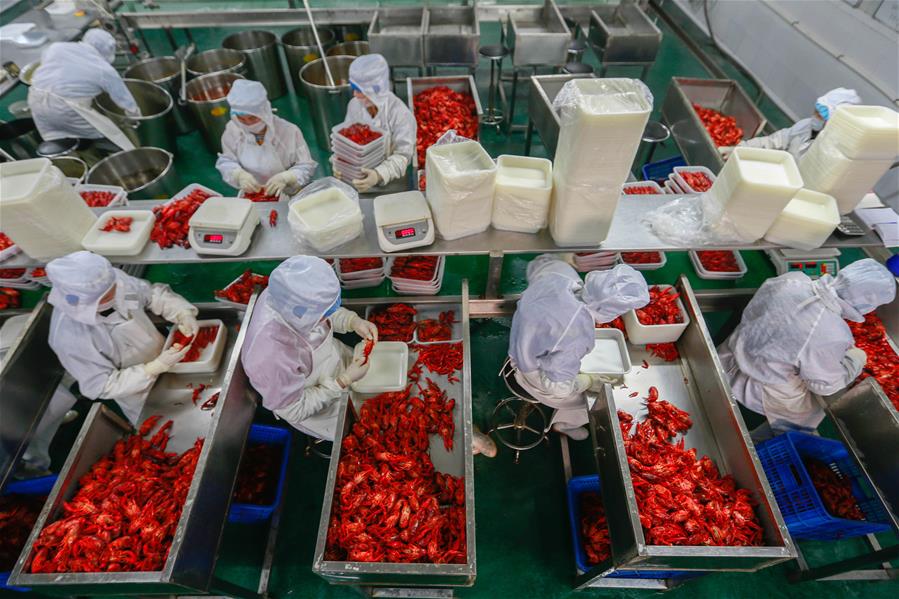 JIANGSU, junio 4, 2017 (Xinhua) -- Trabajadores procesan cangrejos de río en una compa?ía de alimentos en el condado de Xuyi, en la provincia de Jiangsu, en el este de China, el 4 de junio de 2017. Con la innovación de productos y la promoción de la logística de las cadenas de frío, el valor de producción anual de cangrejos de río del país ha superado los diez millones de yuanes. (Xinhua/Zhou Haijun)