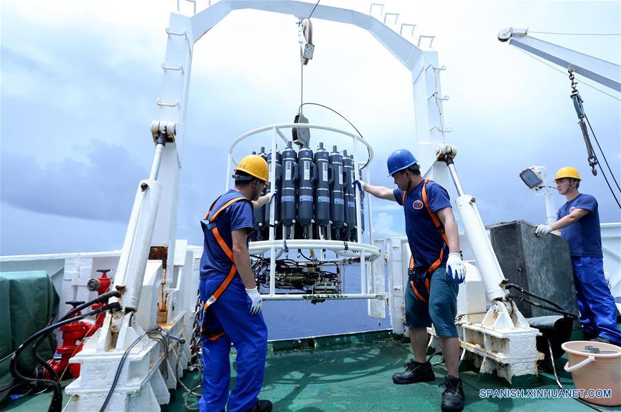 Miembros del equipo de investigación científica prueban el agua del océano con una sonda de conductividad, temperatura y profundidad (CTD) a bordo del Xiangyanghong 09, buque nodriza del sumergible tripulado "Jiaolong" de China, el 3 de junio de 2017. El Jiaolong planea llevar a cabo cinco inmersiones en la Fosa de Yap a partir del 4 de junio. (Xinhua/Liu Shiping)