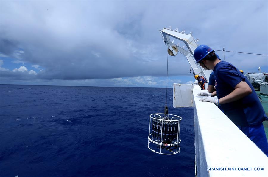A BORDO DEL XIANGYANGHONG 09, junio 3, 2017 (Xinhua) -- Miembros del equipo de investigación científica prueban el agua del océano con una sonda de conductividad, temperatura y profundidad (CTD) a bordo del Xiangyanghong 09, buque nodriza del sumergible tripulado "Jiaolong" de China, el 3 de junio de 2017. El Jiaolong planea llevar a cabo cinco inmersiones en la Fosa de Yap a partir del 4 de junio. (Xinhua/Liu Shiping)