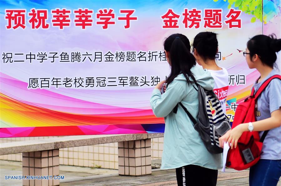FUJIAN, junio 6, 2017 (Xinhua) -- Candidatos del examen nacional de ingreso a la universidad observan un tablero de bendición en un sitio de examen en Putian, provincia de Fujian, en el sureste de China, el 6 de junio de 2017. Un total de 9,4 millones de estudiantes de secundaria chinos realizarán el examen nacional de ingreso a la universidad 2017, conocido como Gaokao, debido a que comienza el miércoles, informó el Ministerio de Educación. (Xinhua/Wei Peiquan)