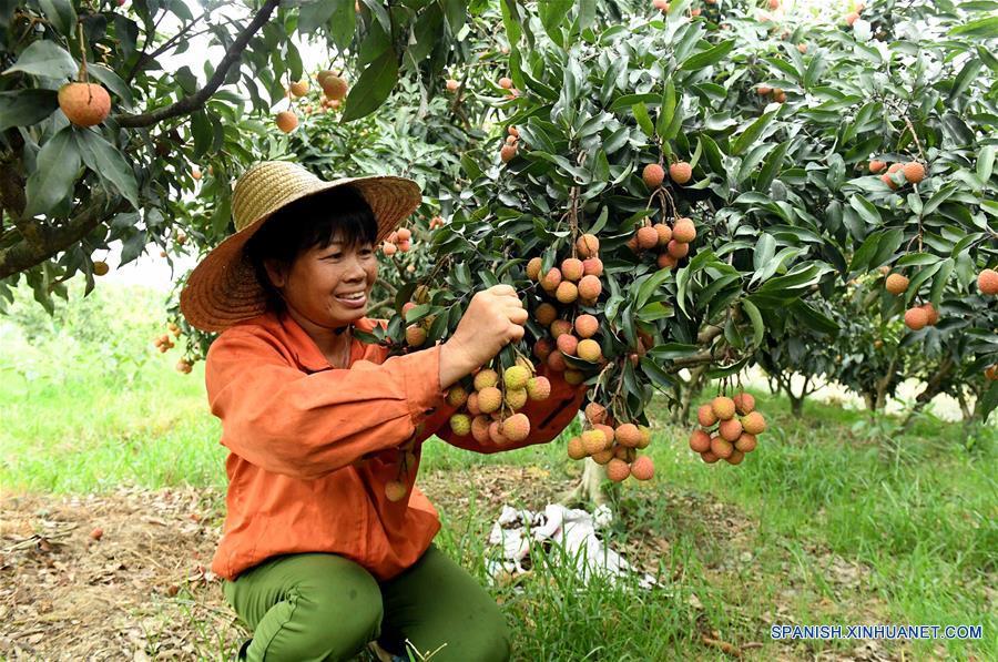 GUANGXI, junio 7, 2017 (Xinhua) -- Una residente recolecta litchi (Litchi chinensis), en el condado de Linshan, en la Región Autónoma Zhuang de Guangxi, en el sur de China, el 7 de junio de 2017. Los agricultores en el lugar comenzaron a cosechar el litchi recientemente. (Xinhua/Zhang Ailin)