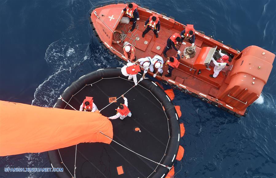 HAINAN, junio 10, 2017 (Xinhua) -- Personas participan durante un simulacro de rescate sobre el mar en el área Xisha en la ciudad de Sansha, en la provincia de Hainan, en el sur de China, el 10 de junio de 2017. La ciudad de Sansha fue establecida en el 2012 para administrar islotes y arrecifes en los grupos de las islas de Xisha, Zhongsha y Nansha, así como las aguas de esta área. (Xinhua/Zhang Weige)