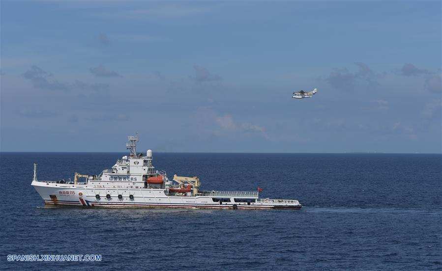 HAINAN, junio 10, 2017 (Xinhua) -- Una aeronave sobrevuela durante un simulacro de rescate sobre el mar en el área Xisha en la ciudad de Sansha, en la provincia de Hainan, en el sur de China, el 10 de junio de 2017. La ciudad de Sansha fue establecida en el 2012 para administrar islotes y arrecifes en los grupos de las islas de Xisha, Zhongsha y Nansha, así como las aguas de esta área. (Xinhua/Yang Guanyu)