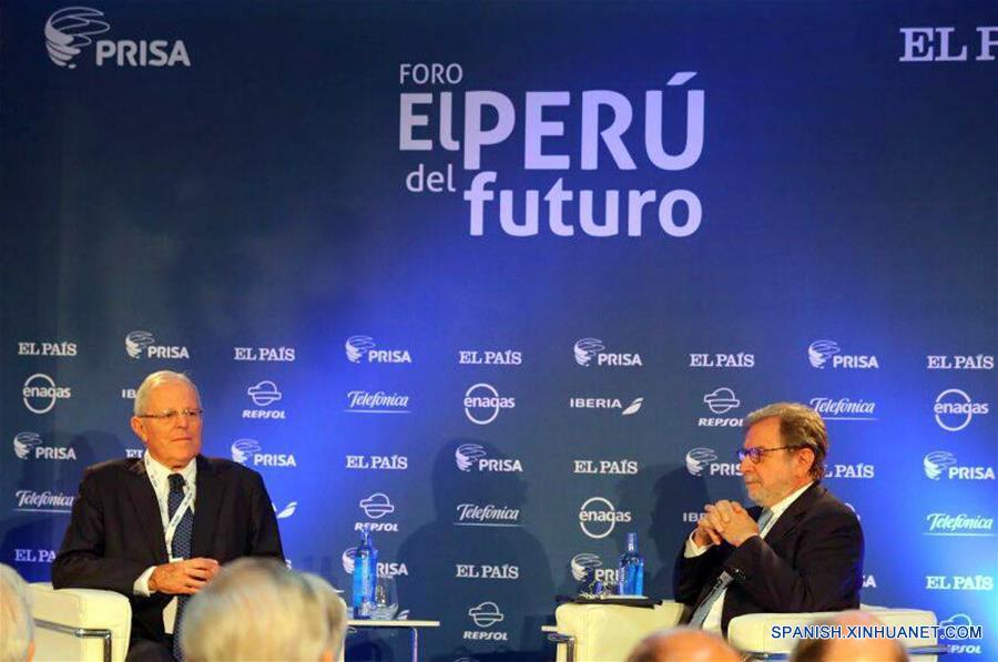 El presidente de Perú, Pedro Pablo Kuczynski (i), participa durante el foro "El Perú del Futuro" en Madrid, Espa?a, el 12 de junio de 2017. De acuerdo con información de la prensa local, el presidente de Perú, Pedro Pablo Kuczynski, se encuentra en una visita de Estado a Espa?a, para reunirse con el presidente del Gobierno espa?ol, Mariano Rajoy, y fortalecer las relaciones bilaterales y promover las inversiones en Perú, además de participar en el foro "El Perú del Futuro", organizado por el diario espa?ol El País. (Xinhua/Andrés Valle/ANDINA)