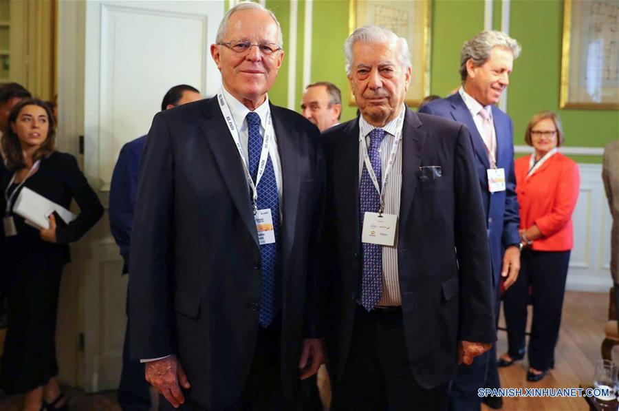 El presidente de Perú, Pedro Pablo Kuczynski (i-frente), y el escritor peruano, Mario Vargas LLosa (d-frente), participan durante el foro "El Perú del Futuro" en Madrid, Espa?a, el 12 de junio de 2017. De acuerdo con información de la prensa local, el presidente de Perú, Pedro Pablo Kuczynski, se encuentra en una visita de Estado a Espa?a, para reunirse con el presidente del Gobierno espa?ol, Mariano Rajoy, y fortalecer las relaciones bilaterales y promover las inversiones en Perú, además de participar en el foro "El Perú del Futuro", organizado por el diario espa?ol El País. (Xinhua/Andrés Valle/ANDINA)