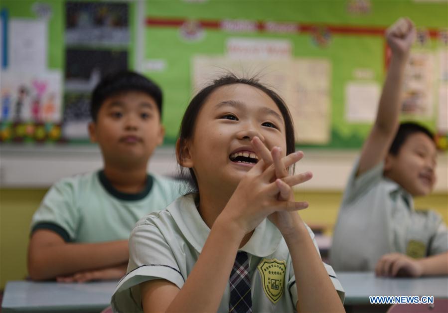 Wen Han asiste a clase de inglés en la Escuela Secundaria Wong Cho Bau de Hong Kong, el 12 de mayo de 2017. [Foto / Xinhua]