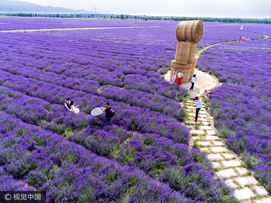 Turistas visitan los campos de lavanda junto al río Ili. Prefectura Autónoma Kazak de Ili de la Región Autónoma Uygur de Xinjiang 14 de junio del 2017. [Foto: VCG]