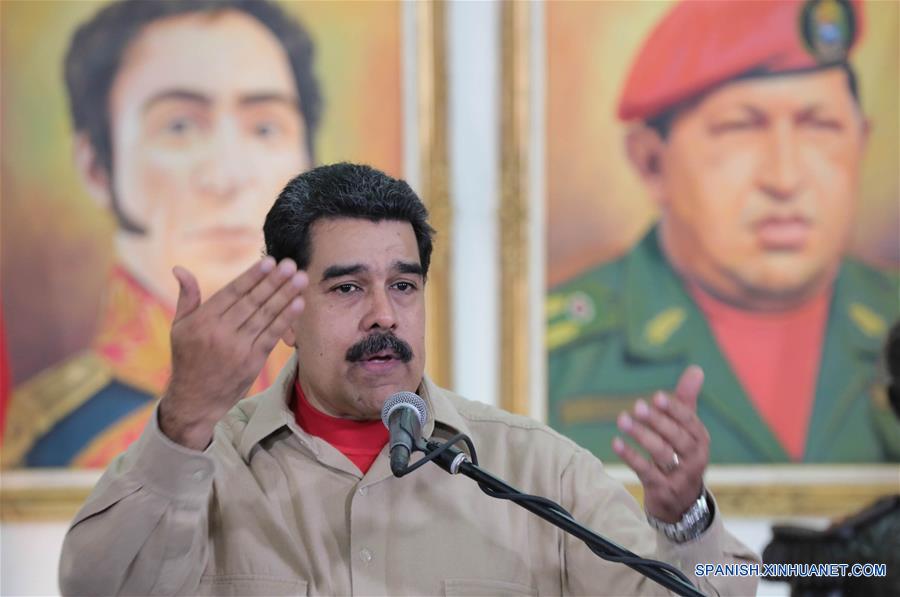 CARACAS, junio 15, 2017 (Xinhua) -- Imagen cedida por la Presidencia de Venezuela, del presidente venezolano, Nicolás Maduro, pronunciando un discurso durante un acto de condecoración a integrantes de la Fuerza Armada Nacional Bolivariana (FANB), en Caracas, Venezuela, el 15 de junio de 2017. El presidente de Venezuela, Nicolás Maduro, condecoró el jueves a varios efectivos de la Fuerza Armada, en reconocimiento a su "batalla tremenda" por la paz, en medio de la violencia que se ha desatado en esta nación. Durante el evento, Maduro calificó de "despreciables" las declaraciones del vicepresidente de Estados Unidos, Mike Pence, quien pidió a los países de la región denunciar el presunto "abuso de poder" en Venezuela. (Xinhua/Presidencia de Venezuela)