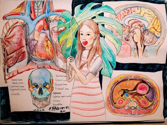 Shanghai, 19/06/2017 (El Pueblo en Línea) -Un autorretrato de Song Linlin rodeado de imágenes de órganos humanos. Una estudiante de medicina de la Universidad de Fudan en Shangahi está celebrando su graduación mostrando su talento en la pintura. Song Linlinha cursado la carrera de medicina en la Universidad Fudan. Ella es también una talentosa artista, creando bellas pinturas de órganos humanos. [Foto proporcionada por Song Linlin]