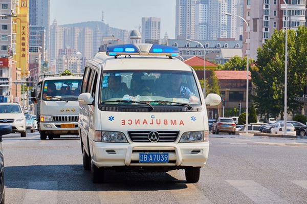 Una ambulancia escolta al camión durante el transporte del laboratorio al Centro Médico de Mujeres y Ni?os de Dalian. [Foto: Ma Xiaohui]