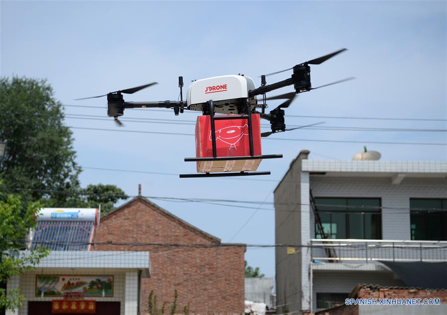 Un dron del que está colgado un paquete del gigante de comercio electrónico JD.com llega al sitio de aterrizaje en el pueblo Shijia de la ciudad de Xi′an de la provincia de Shaanxi.