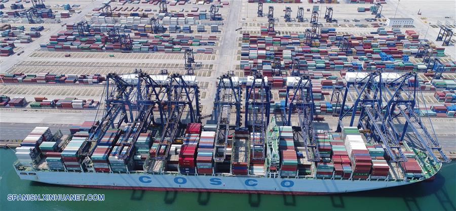 DALIAN, junio 20, 2017 (Xinhua) -- Imagen tomada el 13 de junio de 2017 de una vista aérea de la terminal de contenedores del puerto de Dalian en Dalian, provincia de Liaoning, en el noreste de China. Dalian es una de las ciudades sede del Foro Davos de Verano. (Xinhua/Xing Guangli)