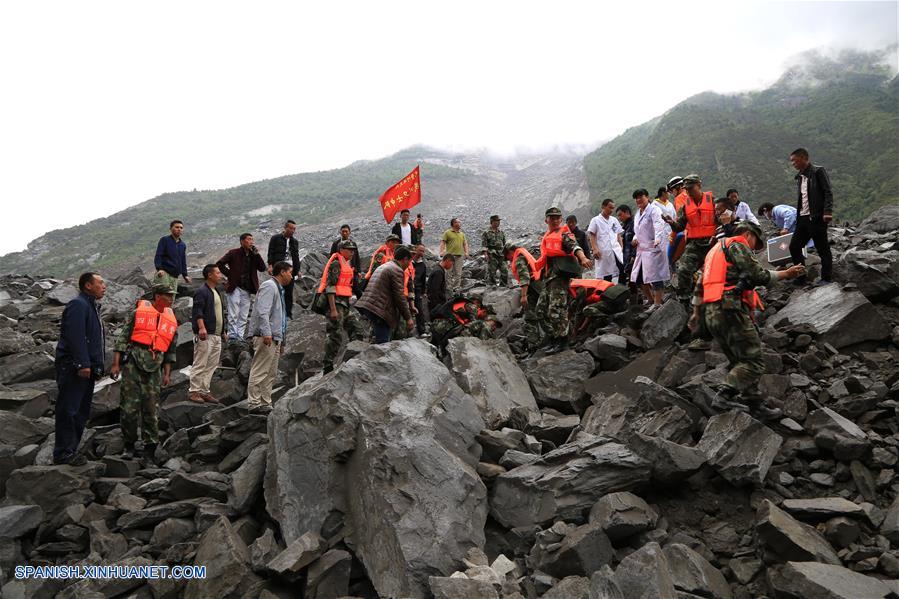 SICHUAN, junio 24, 2017 (Xinhua) -- Rescatistas trabajan en el sitio de un accidente después de un deslave en el poblado de Xinmo del condado Maoxian de la prefectura autónoma tibetana y qiang, en la provincia de Sichuan, en el suroeste de China, el 24 de junio de 2017. Un deslizamiento de tierra el sábado aplastó unas 40 casas, donde se teme que estén enterradas unas 100 personas. (Xinhua/He Qinghai)