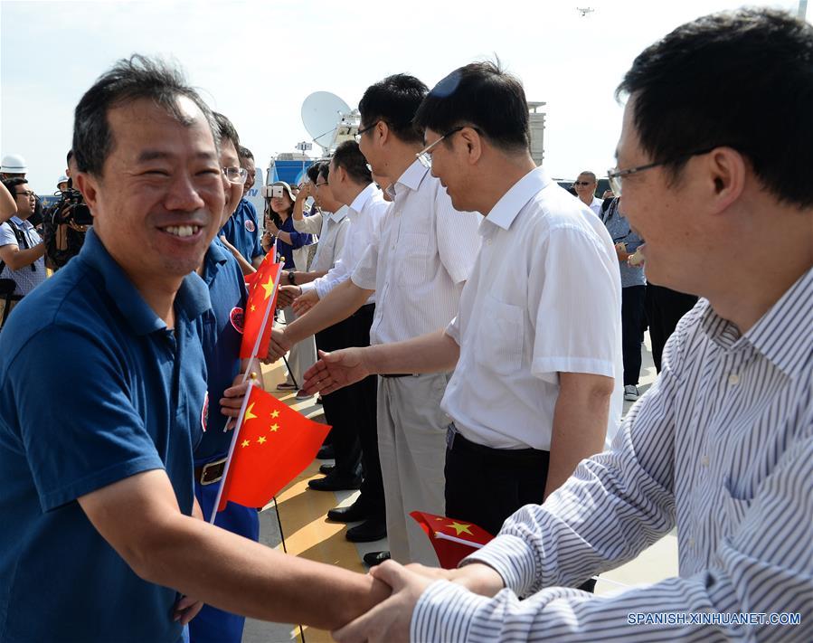 Investigadores científicos del Jiaolong asisten a una ceremonia de bienvenida, en Qingdao, provincia de Shandong, en el este de China, el 23 de junio de 2017. (Xinhua/Zhang Xudong)