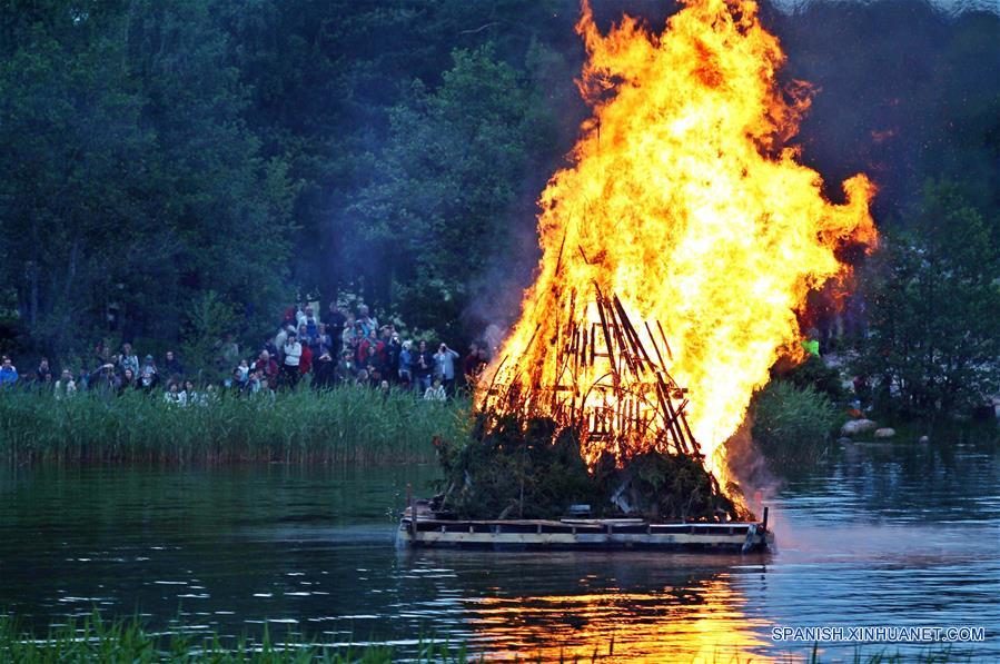 Imagen del 23 de junio de 2017 de una vista de una fogata en la playa durante una celebración del Día del Solsticio de Verano, en Helsinki, Finlandia. (Xinhua/Zhang Xuan)
