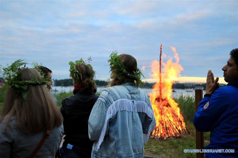 Imagen del 23 de junio de 2017 de personas observando las fogatas en la playa durante una celebración del Día del Solsticio de Verano, en Helsinki, Finlandia. (Xinhua/Zhang Xuan)