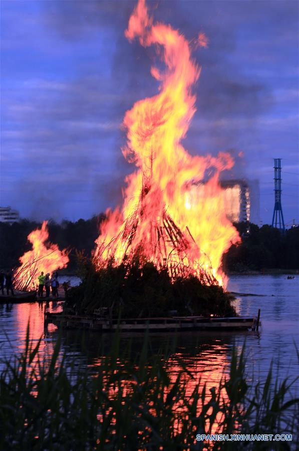 HELSINKI, junio 24, 2017 (Xinhua) -- Imagen del 23 de junio de 2017 de fogatas siendo encendidas en la playa durante una celebración del Día del Solsticio de Verano, en Helsinki, Finlandia. (Xinhua/Zhang Xuan)