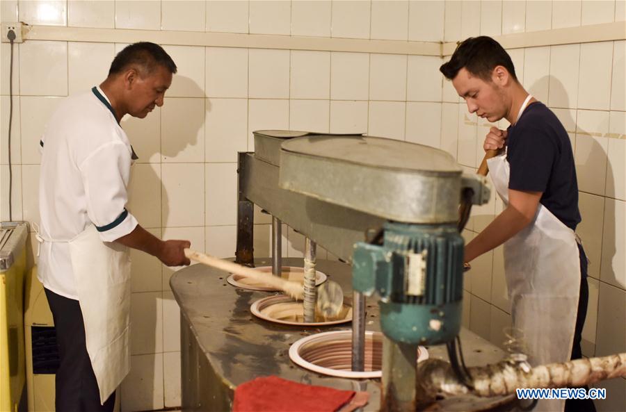 Memetynsup Sidiq, de 67 a?os, es el due?o de Margilan, ubicada en la zona turística de Kazanqi. Esta es la heladería más antigua de Yining, abierta por su padre en el a?o 1933. Memetynsup heredó el local y lo transformó en un restaurante de comida rápida, aunque el atractivo principal sigue siendo la venta de helados. Durante la temporada turística, la clásica heladería Margilan vende a diario más de 50 kilogramos de helado. En la foto, Memetynsup y su nieto Adiljan (a la derecha) revuelven el helado tradicional. Yining, Región Autónoma de Uygur de Xinjiang. 22 de junio de 2017. [Foto: Xinhua]