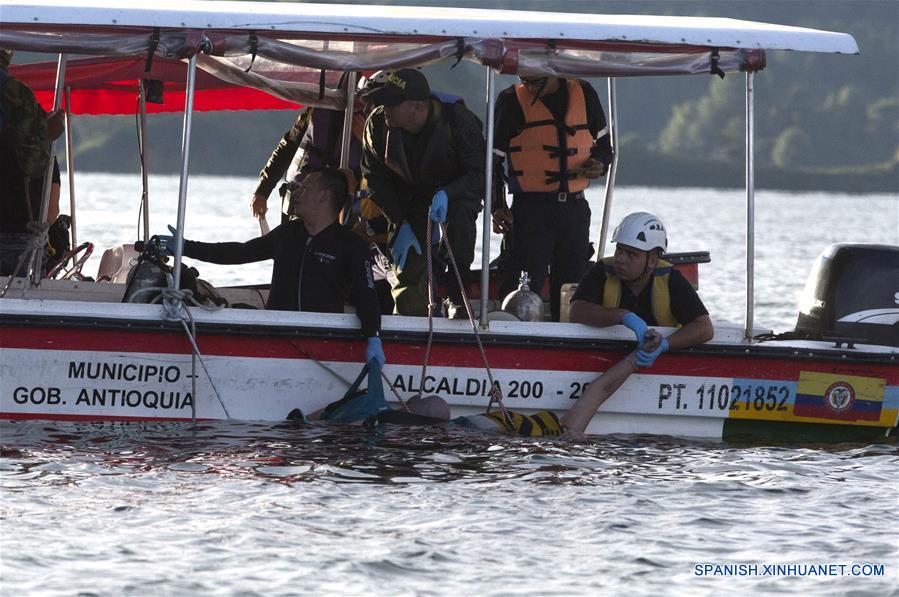 GUATAPE, junio 26, 2017 (Xinhua) -- Rescatistas y miembros de las fuerzas de seguridad recuperan un cuerpo en el sitio del naufragio del barco turístico "El Almirante" en Guatapé, departamento de Antioquia, Colombia, el 26 de junio de 2017. Al menos nueve personas muertas, 24 heridas y 28 desaparecidas dejó el domingo el naufragio de un barco turístico que se hundió poco después de zarpar de un muelle en el embalse el Pe?ol-Guatapé, en el departamento colombiano de Antioquia, informó un portavoz oficial. (Xinhua/Juan Antonio Sánchez/COLPRENSA)