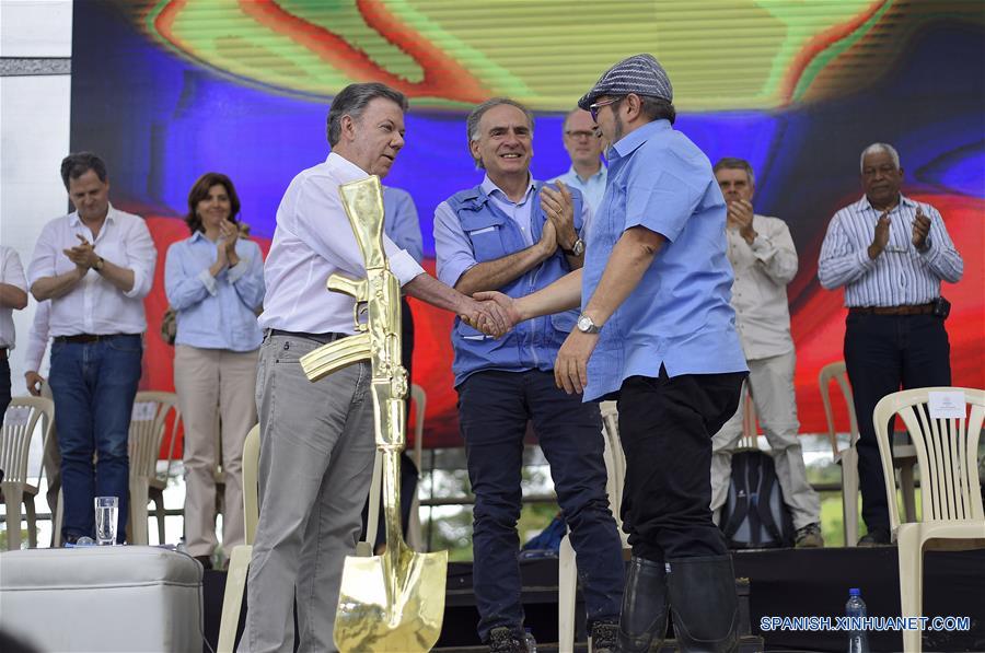 Imagen cedida por la Presidencia de Colombia, del presidente colombiano, Juan Manuel Santos (i-frente), estrechando la mano con el jefe máximo de las Fuerzas Armadas Revolucionarias de Colombia (FARC), Rodrigo Londo?o alias "Timochenko" (d-frente), ante la mirada del Jefe de la Misión de Naciones Unidas en Colombia, Jean Arnault (c-frente) junto a un arma que simboliza la paz, durante la ceremonia de dejación de armas de las FARC, en Buenavista, una vereda del municipio de Mesetas, en el departamento de Meta, Colombia, el 27 de junio de 2017. En Buenavista, una vereda del municipio de Mesetas, en el departamento de Meta, se realizó el martes el acto final de dejación de armas por parte de la guerrilla de las Fuerzas Armadas Revolucionarias de Colombia (FARC). El acto estuvo encabezado por el presidente colombiano, Juan Manuel Santos; el jefe máximo de las FARC, Rodrigo Londo?o alias "Timochenko", y el Jefe de la Misión de Naciones Unidas en Colombia, Jean Arnault. En el evento también participaron ministros y altos funcionarios, representantes de países garantes, facilitadores del Acuerdo de Paz, autoridades civiles, congresistas y miembros de organizaciones sociales. (Xinhua/Efraín Herrera/Presidencia de Colombia)