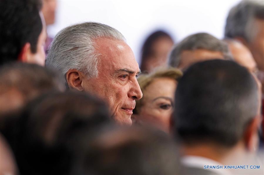 Imagen cedida por la Presidencia de Brasil, del presidente brasile?o, Michel Temer (i), participando durante una conferencia de prensa en Brasilia, Brasil, el 27 de junio de 2017. En su primera declaración tras ser denunciado penalmente por corrupción, el presidente de Brasil, Michel Temer, dijo el martes que las acusaciones en su contra son "una pieza de ficción", que no existen pruebas de que haya cometido actos ilícitos y que no huirá a las batallas que se le presentan por delante para defender su cargo y su honra. (Xinhua/Beto Barata/Presidencia de Brasil)