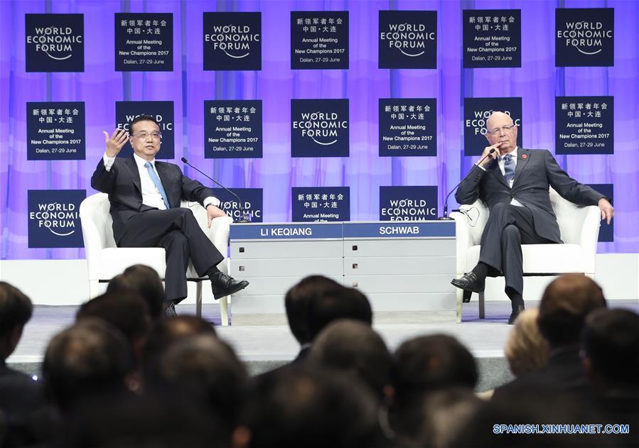 El primer ministro, Li Keqiang pronuncia un discurso en la ceremonia inaugural de la Reunión Anual de Nuevos Campeones 2017, también conocida como el Foro Davos de Verano, en la ciudad costera china de Dalian, en el noreste del país.(Xinhua/Pang Xinglei)